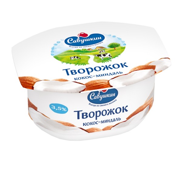 Состав: изготовлен из творога (молоко обезжиренное пастеризованное с использованием закваски; сливок пастеризованных; наполнителя "Кокос-миндаль" (сахар, вода; миндаль, кокос; пищевые добавки: стабилизаторы - каррагинан и его калиевая, натриевая, аммонийная соли, включая фурцеллеран, натуральный ароматизатор "Марципан", дикрахмалфосфат оксипропилированный; ароматизаторы идентичные натуральным - «Кокос», «Орех», консервант - сорбат калия), сахар, комплексной пищевой добавки (желатин, стабилизаторы - гуаровая камедь,камедь рожкового дерева). Содержит орех. Может содержать следы яйца, глютена.
